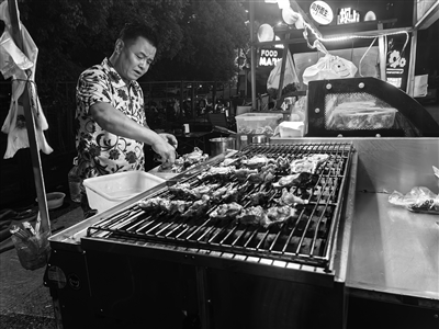 烤架上嗞嗞作响的肉串、现切椰子的清甜香气、手打柠檬茶的捶打声——这些曾游荡在城市角落的流动摊贩,如今在白色方格摊位中找到归宿。