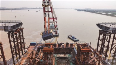 10月10日,广州南沙区万龙大桥吊装架设首节段主塔。万龙大桥跨越珠江口龙穴南水道,全长5146米,主桥长1150米,主跨608米,为粤港澳大湾区又一世界级桥梁。这是浮吊船在珠江口吊装万龙大桥主塔首节段钢塔,钢塔是主塔钢塔柱与混凝土塔座的过渡关键结构(无人机照片)。