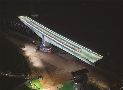10月10日凌晨,深(圳)江(门)铁路广中江特大桥跨广珠货运铁路转体桥成功转体,该转体桥重达11216吨、跨度160米,位于深江铁路关键控制性工程广中江特大桥跨虎跳门桥段。深江铁路建成后,深圳与江门可实现1小时内通达。这是转体中的转体桥(无人机照片)。