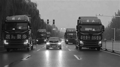 视频画面显示,打头的奔驰婚车两侧一共6辆红色解放牌大卡车迎面而来,车头还张贴有“扈府娶亲”“早生贵子白头偕老”“并肩同行长征路齐心共谱幸福家”等祝福标语。