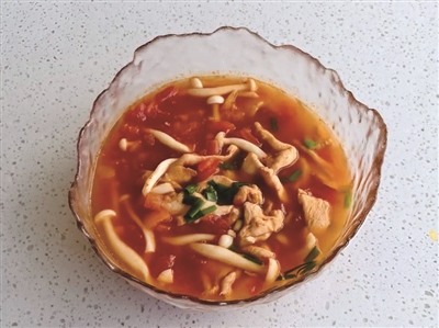 商报记者 王然 通讯员 董燕儿 鸡胸肉、番茄、白玉菇这些菜场里随处可见的平价食材,藏着最治愈的本真鲜香。它们自带优质蛋白与丰富维生素,热量低却饱腹感十足,既能帮你稳稳抵御零食诱惑,又能为身体轻盈补充能量,消化毫无负担,堪称减脂期的“神仙搭档”。 这道茄汁鸡胸肉做法格外简单,无需高深厨艺,煎炒焖煮几步就能搞定,最大程度锁住食材的原生营养与鲜嫩口感。出锅后茄汁红亮油润、香气扑鼻,鸡胸肉嫩滑丝毫不柴,酸甜滋味在舌尖层层散开,无论是作为减脂期的主食好搭档,还是日常餐桌的开胃硬菜,都能完美“hold住”场面。 制作步骤:鸡胸肉切片,加入适量料酒和盐搅拌均匀备用;番茄切成小丁,锅中喷少许油加入番茄炒出汤汁,加盐调味后倒入开水;放入白玉菇和腌好的鸡胸肉,盖锅盖焖煮5分钟;最后撒上翠绿葱花就能出锅。