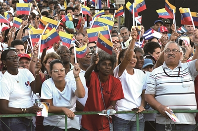 10月17日,在古巴首都哈瓦那,古巴民众挥舞旗帜参加集会。当天,5万多古巴民众聚集在首都哈瓦那总统大道的西蒙·玻利瓦尔雕像前,抗议美国军事威胁委内瑞拉,表达对委内瑞拉人民和政府的坚定支持。