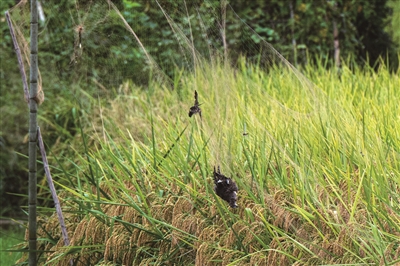 一处稻田旁的违法捕鸟网,这些网线非常细,鸟儿很难发现,一旦缠上基本就面临死亡。