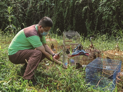 工作人员正在放飞违法饲养的野生鸟类。