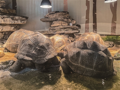 “萌宠中心”里还有一个两爬馆,展出蛇类、蜥蜴、龟类等动物,比如各种体色变异的蟒蛇,浑身长毛、拳头一般大的狼蛛,看起来有点吓人的巨蜥,有着粗壮大腿、体大如磨盘的亚达伯拉象龟……