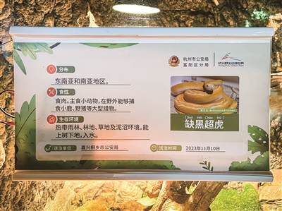 每个被救助动物的玻璃窗外面都贴着一张铭牌,上面标明了动物名称、分布、习性、生存环境等信息。