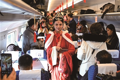 12月23日,工作人员(中)在包银高铁D4667次动车组列车上与旅客互动。新华社发