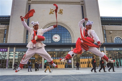 12月26日,当地群众在延安火车站前表演安塞腰鼓。新华社发