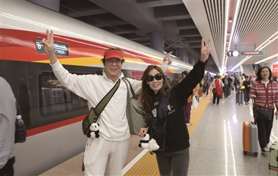 12月22日,搭乘从广州白云站开往湛江北站首发列车的旅客在广州白云站留影。新华社发