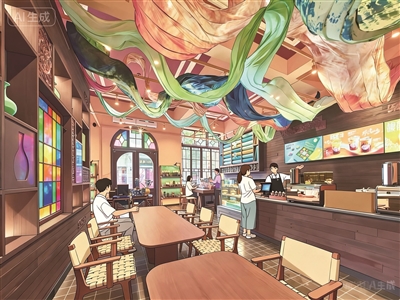 店内还有三块杭罗屏风。它们由杭罗手工织造技艺国家级非遗代表传承人洪桂贞、老字号“福兴杭罗”,还有本土年轻艺术家联手打造。用“杭间物叙”“罗织遗韵”“星绽咖梦”三个主题,设计了杭州特产、杭罗非遗、咖啡宋韵三个画面,讲述杭州过去和现在的故事。
