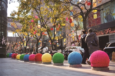 在临近杭州解百A座的吴山路和解放路上,不少商场门口的石墩子都穿上了定制的“多巴胺”毛衣,色彩丰富,造型可爱,也为过往的市民游客提供了温软的坐垫,成为杭城街头一道富有创意且充满温情的亮丽风景。 商报记者 项凯 摄影报道