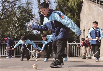 1月9日,绍兴诸暨市陶朱街道白门完小的学生在操场上打陀螺。近期,诸暨市陶朱街道中心学校下属各小学开设了传统游戏课程,打陀螺、跳房子、踩高跷等多项传统游戏让学生们玩得不亦乐乎。