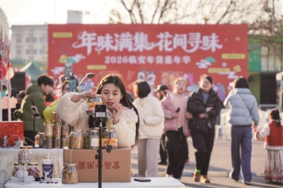 年味浓 1月10日至11日,2026临安年货嘉年华在临安区花间里火热举办。本次嘉年华推出妈妈的味道年货区、文创手工区、新年便捷服务区、电商直播区等八大主题区,花式解锁“边玩边购边囤”的年货新体验,营造了浓厚的新年氛围,吸引众多市民参与。图为昨天主播在嘉年华上直播推广临安农货品牌。 商报记者 项凯 摄影报道