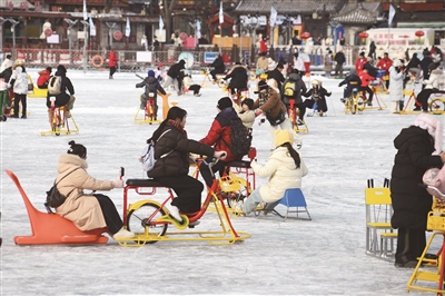 1月18日,雪后的北京银装素裹,市民、游客纷纷出门赏雪游玩。这是人们在北京什刹海玩冰车。