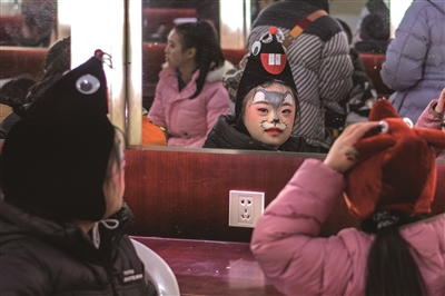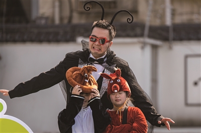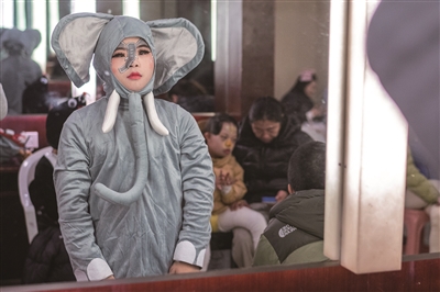 于越的演出服是一套披着黑纱披风的燕尾服,脑门画着一个大大的苍蝇头。他的角色戏份最多,走位比较复杂,演出前他有点紧张,向领队孙乐老师和程锦萱老师求助“我又弄不清楚了”。