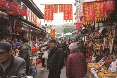 选了一个晴朗的午后,我来到名气不小的大马弄。还没到巷口,浓郁的生活气息便扑面而来。酱鸭、酱肉、猪头肉被整整齐齐地挂了起来,成了一面面“酱货墙”。太阳晒着,油汪汪的鸭屁股尖尖上还滴着油。走进巷子,这么一条窄窄的巷子里挤满了人,随着人流慢慢往另一头移动。巷子里,瓜子花生、果脯蜜饯,年货一摊接着一摊;现包的春卷、现炸的葱包烩,每个摊位前都挤满了人;各家手工包的大粽子一家比一家堆得高……春节前那种说不上来的忙碌感,在大马弄一下就体现了出来。