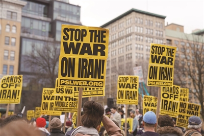 3月7日,人们在美国纽约参加集会游行,抗议美国和以色列对伊朗发动军事打击。