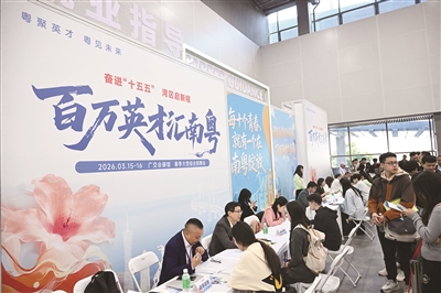 3月15日,“百万英才汇南粤”2026年春季大型综合招聘会在广州的中国进出口商品交易会展馆开幕。这场人才盛会汇聚近2000家头部单位,提供超8.5万个岗位。这是应聘者在招聘会现场的就业指导展区进行政策咨询。