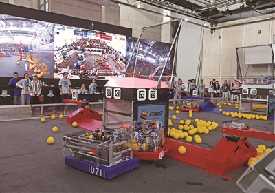 3月13日至15日,2026FIRST机器人竞赛(FRC)上海国际区域赛在华东师范大学闵行校区举行,来自国内外的50支参赛队伍、近千名青少年选手同台竞技,围绕主题“发掘重建”展开机器人科创比拼与智慧角逐。这是15日的比赛现场。