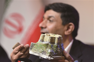 3月31日,在伊朗首都德黑兰,伊朗联合国教科文组织全国委员会秘书长哈桑·法尔图西手持法拉克·奥尔·阿夫拉克城堡的模型出席新闻发布会。法拉克·奥尔·阿夫拉克城堡近日在美国和以色列发动的袭击中受损。新华社发