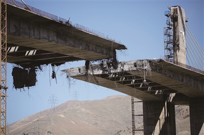 这是4月3日拍摄的伊朗卡拉季市贝伊克公路桥遭空袭受损状况。这座大桥获称“中东最高桥梁”、伊朗标志性工程杰作,尚未通车。新华社发